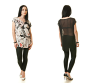 Эксклюзивная стильная блуза-туника черно белого цвета. Спереди декорирована принтом в виде изображения Мерлин Монро. Спина – прозрачный шифон. В наличии осталось две единицы S/M и M/L.