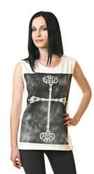 Длинная майка-борцовка украшена принтом с изображением креста, декорированного металлическими заклепками. Ткань-трикотаж, состав- 100%хлопок. В наличии осталась-1 -размер S.