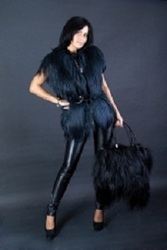 0124. Жилет в комплекте с сумкой из яка Kasta-Mexa Жилет в комплекте с сумкой из яка Италия. Модель с показа Roberto Cawalli. Мех в сочетании с кожей лак .Мех на жилете черно-чернильного цвета, мех на сумке в противовес иссиня черный.